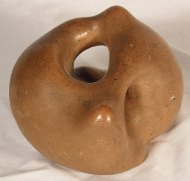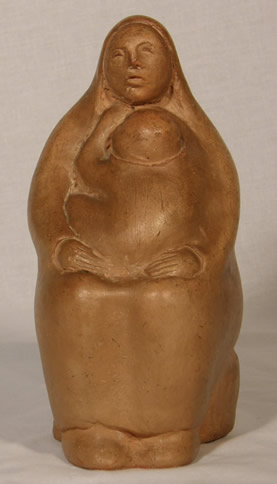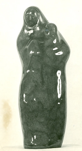 Del 1951 è anche il bozzetto per un concorso a Sanremo: "Monumento ai Caduti di tutte le guerre". Come si vede dalla foto, l’opera è sulla stessa linea, sullo stesso intendimento a forme fluide delle ceramiche, ma qui c’è un valore aggiunto di contenuto: il pathos. La madre che richiama nel suo grembo la testa del figlio soldato caduto e quel volto del figlio talmente vuoto… quel vuoto gridante… Ognuno può dare la sua interpretazione. Purtroppo la motivazione da parte dell’autore che accompagnasse il progetto non è stata trovata. Al sicuro è invece il piccolo modello in gesso. |