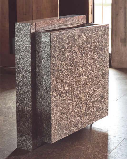 | La diagonalizzazione è anche qui l’elemento stilistico fondamentale: nell'acquasantiera, il blocco entro cui è ricavata la vasca per l’acqua benedetta si inserisce diagonalmente in un parallelepipedo portante vuoto, di cui si osserva il perimetro. L’opera è in granito grigio marezzato, perfettamente lucida. |