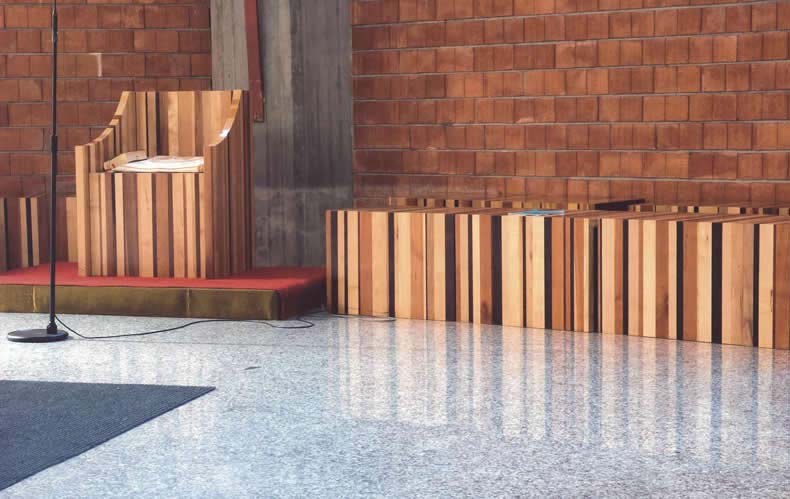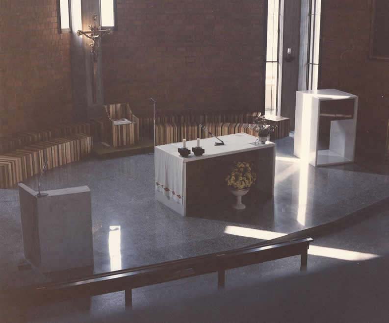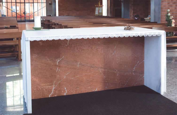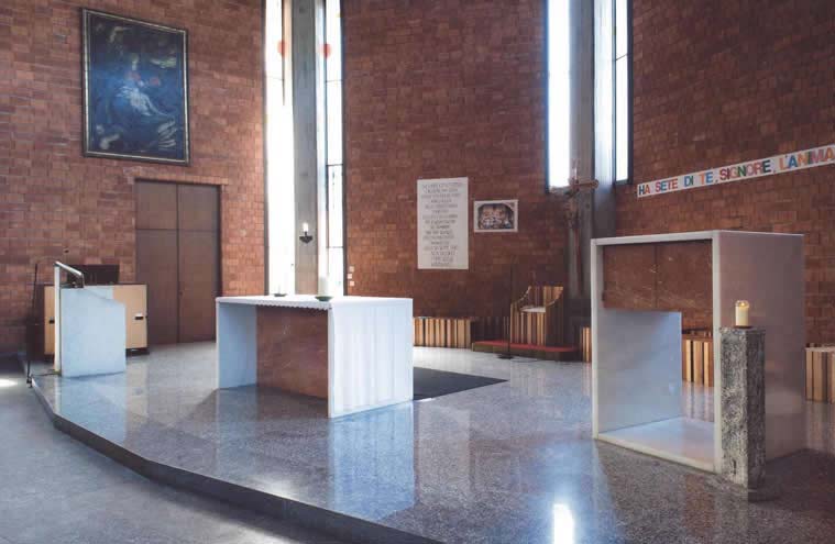 | L’Altare è un parallelepipedo vuoto, praticamente un telaio, formato di lastre di marmo bianco. “Una tovaglia di ghiaccio” il piano della celebrazione, dice il parroco ricordando parole dell’autore. |