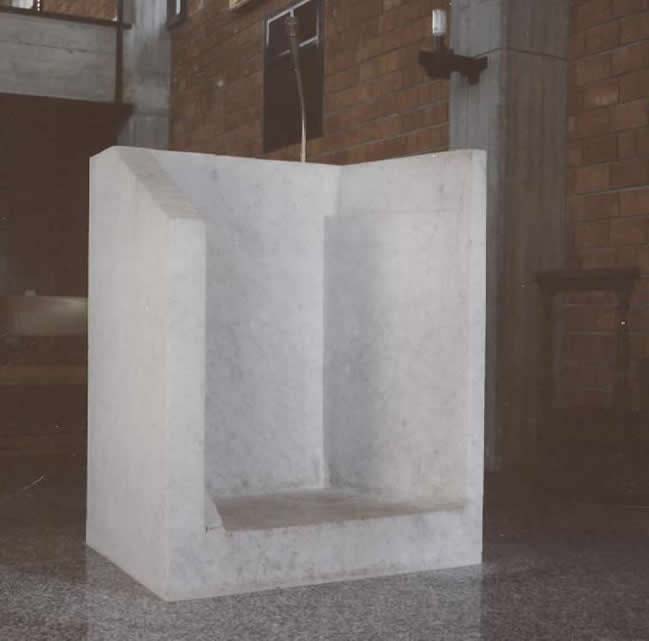 | L’Ambone è un blocco di marmo bianco di Carrara, svuotato internamente. Il celebrante non si deve solo accostare, come succede in Sant’Agata, ma vi deve entrare e si trova circondato dai tre lati della scultura. |