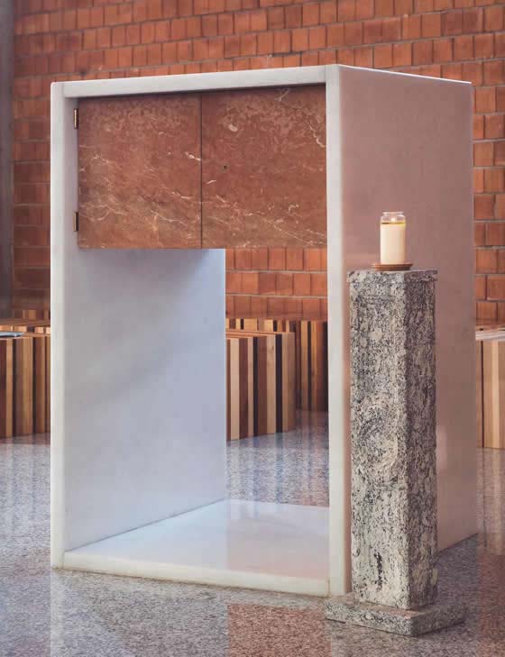 Il rapporto tra Altare e Tabernacolo è strettissimo. Quel bianco e quel rosso: quel perimetro bianco tagliato a metà dal marmo rosso nell’Altare, quel perimetro bianco contenente il cubo di marmo rosso nel Tabernacolo.
