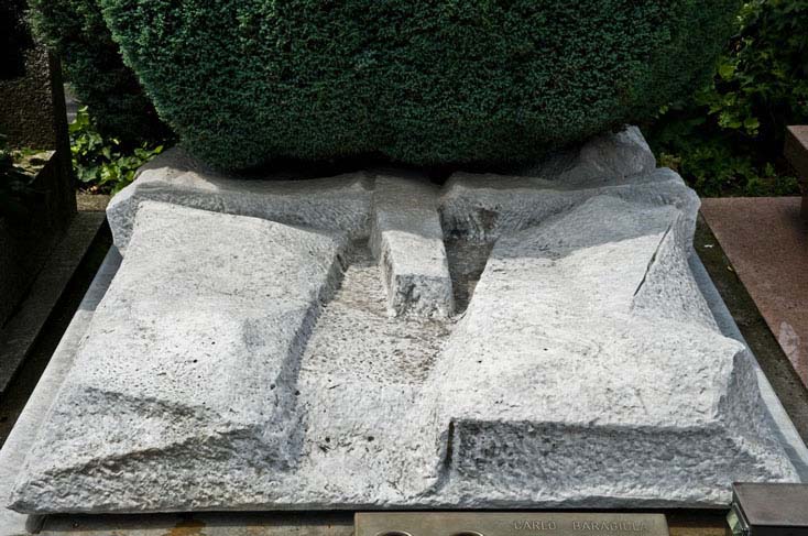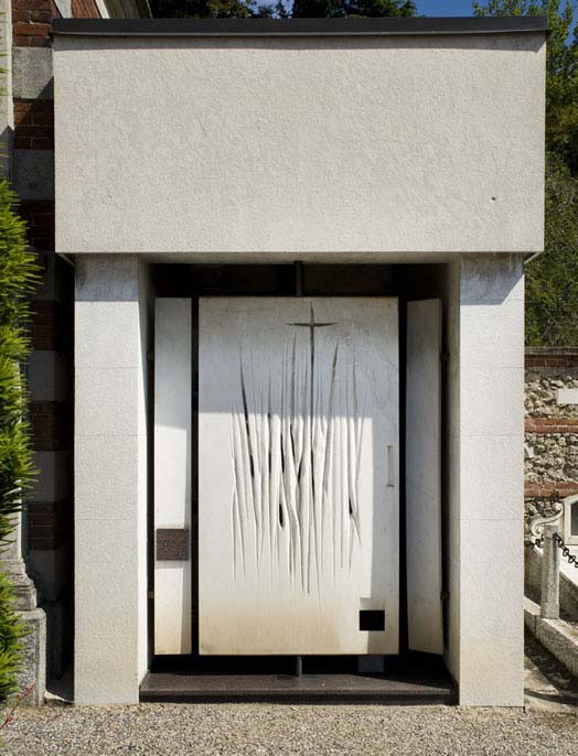 E’ la cappella per la famiglia Gaggio, al cimitero di Lomazzo. Una lastra di marmo bianco, con tagli verticali, vagamente incrociantisi.