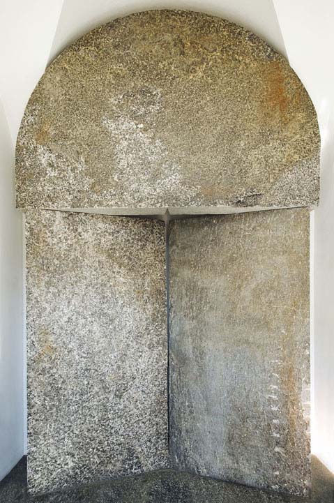 Qui il vuoto è una croce, spazio creato tra due grosse pietre grezze verticali diagonalizzate, sormontate da una terza pietra orizzontale tagliata a formare una sorta di rotondo cielo (foto G.Buscema).