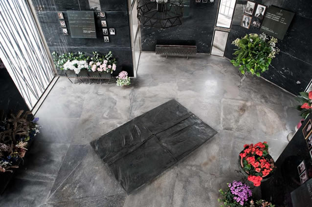 Infine, ancora una cappella astratta, un tempietto polifunzionale che ospita sei famiglie: analoga come immagine alle precedenti Gaggio e Azzimonti, è una lastra tombale, che di nuovo ricorda l’iconografia della Croce. Cimitero di Monteolimpino. (Foto G.Buscema)