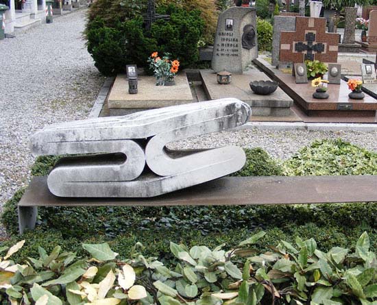 Tra le opere non figurative nei cimiteri si inserisce a titolo assoluto la tomba Severgnini, del 1980. E’ un’opera nata in laboratorio, appartenente al filone più stretto della ricerca personale dell’autore, e per la precisione al gruppo ‘seriale’ di lavori che Eli Riva chiamò “Moduli”, nati per filiazione diretta dalla ‘serie’ delle “Arfalle”, a partire dal 1975.