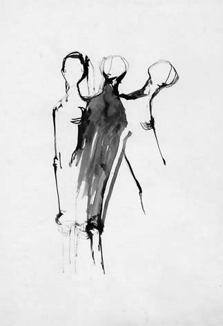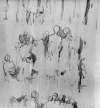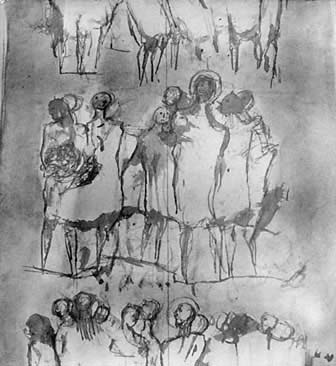 il passaggio da questa visione affollata a quella definitiva con pochi personaggi non è immediato, ed è evidenziato chiaramente da un altro bozzetto.