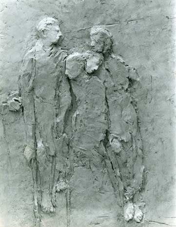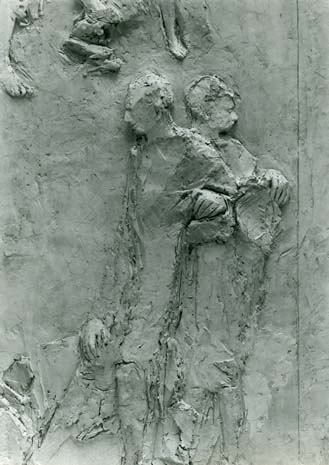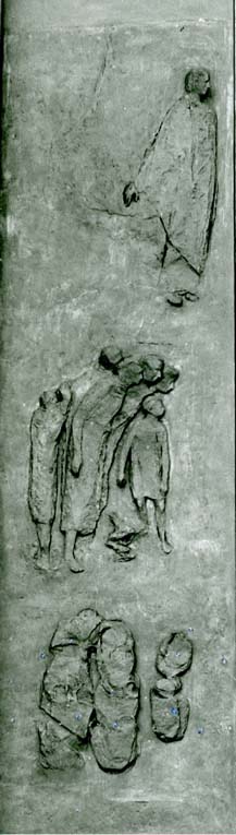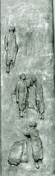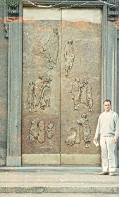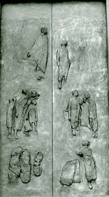 Il piano di fondo del portale non è rigido: una esperienza già fatta nel pannello in bronzo “Il sogno di Giacobbe” collocato nella chiesa del cimitero monumentale di Como. E dalla movimentata superficie di bronzo le figure appena accennate sembrano emergere (come da lontano) con linee non dure e incisive, ma morbide e fluttuanti. Il percorso dalla rigida rappresentazione relegata a contorni precisi, a quella di figure libere sulla superficie è completo.