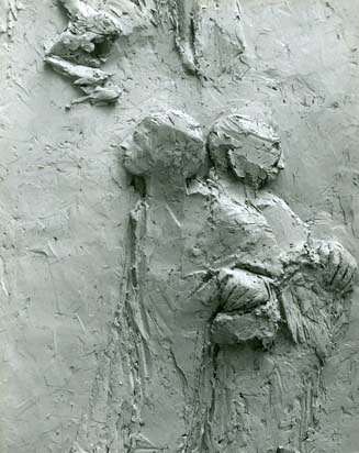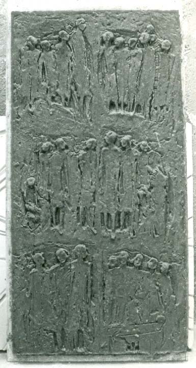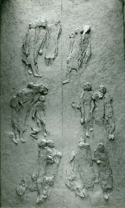 | Scrive Luciana Macera in merito al portale di Chiasso nell’articolo pubblicato sulla rivista “Periscopio” già citato a proposito delle sculture degli anni 1956-’58 : “… geniale nella modulazione di un piano che non è rigido ma flessibile, e dal quale la figurazione emerge per accenni e suggerimenti plastici”. Se il portale del Santuario di Diano Marina aveva un’impostazione simmetrica nella distribuzione delle “storie” della Madonna, il portale di Chiasso è invece risolto più liberamente, con le figure che dal piano escono nel vuoto, e con la composizione studiata per una doppia lettura, a battenti chiusi e a battenti aperti. |
