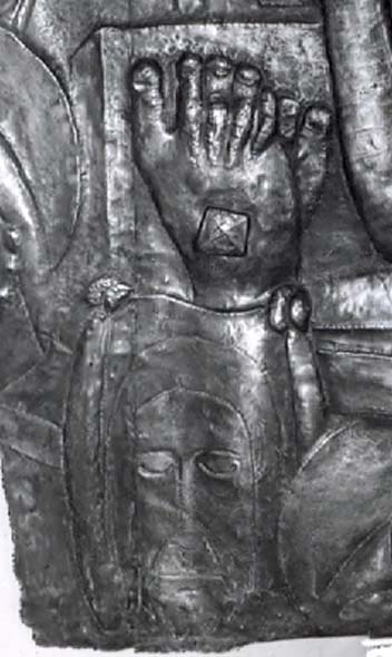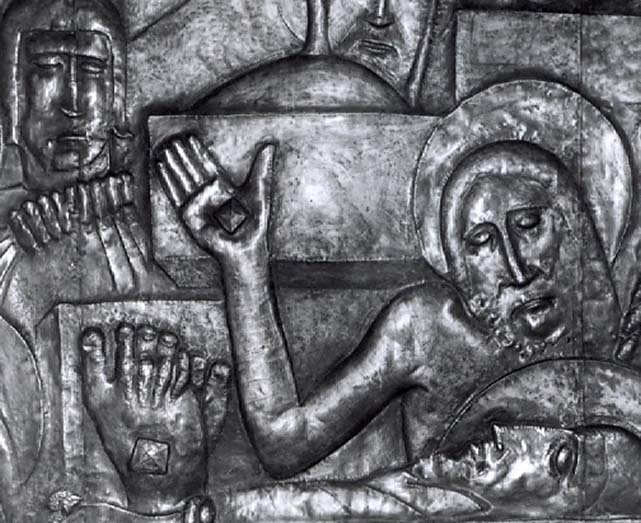 Il piede gigante, inchiodato, al pari della mano inchiodata più sopra. ‘Perché quel piede?’ fu chiesto all’artista. ‘Perché Gesù nella sua solitudine guardando in basso vedeva solo il suo piede’.
