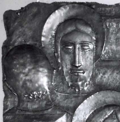 Prendiamo dalla tesi di laurea di Lucia Mandressi dedicata all’arte sacra di Eli Riva (Università Statale di Milano, febbraio 2010): “La cappella non offre molto spazio, Riva decide così di creare un unico pannello (7 metri quadrati) che riassuma tutte le tappe del cammino alla Croce. Le stazioni si susseguono così in un continuum circolare, senza divisioni nette tra loro e l’impresa è possibile grazie all’abilità di Riva nel portare la pratica del cesello dalle piccole alle grandi dimensioni. L’opera è dunque innovativa per diversi motivi: per le grandi dimensioni affrontate con il rame e per l’idea di riunire tutte le stazioni in un’unica grande visione senza cesure. Le misure del pannello e l’esiguità della chiesa impongono poi allo scultore un’altra scelta narrativa, quella di restringere ai soli volti dei personaggi la raffigurazione dell’episodio evangelico, accompagnati ora sì ora no da un particolare accessorio e simbolico. I volti, fulcro del racconto figurato, vengono così caricati di forte espressività.