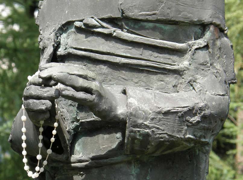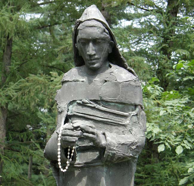 Il volto scarno, il saio sgualcito, le mani sacrificate ma unite da un gesto di protezione e di chiamata a raccolta dei fedeli”.