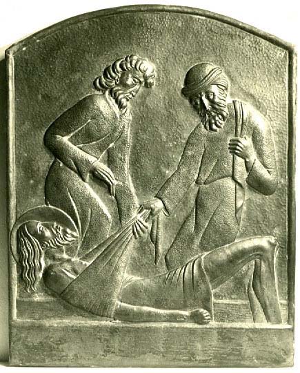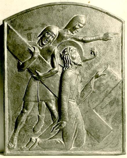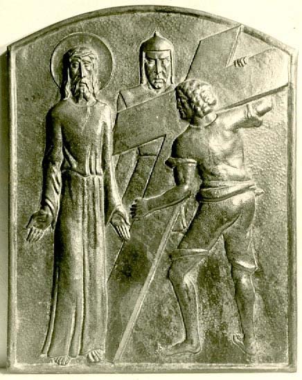 Il tema della “Via Crucis” torna più volte nella produzione scultorea di Eli Riva, sia per volere dei committenti, sia per libera scelta dell’artista, “profondamente colpito dal doloroso racconto dell’Uomo sulla via del Calvario”. Eli Riva si definiva infatti “cristologico”. Una prima “Via Crucis”, giovanile, fu eseguita in Ticino quando, dopo aver lasciato Milano e dopo un soggiorno culturale a Parigi con l’amico pittore Brignole D’Arena, egli si trasferì nella vicina Svizzera Italiana per una permanenza lavorativa nello studio dello scultore svizzero Remo Rossi, all’incirca tra il 1946 e il 1948. Di questa “Via Crucis” purtroppo abbiamo perso le tracce. Non siamo a conoscenza di quale sia la chiesa che la ospita e invitiamo chi ne avesse notizie a fornirle. |