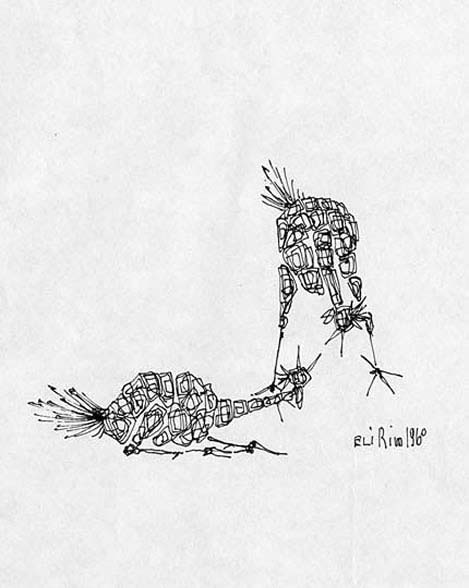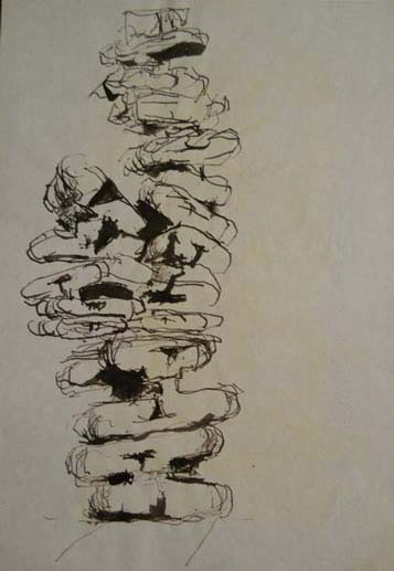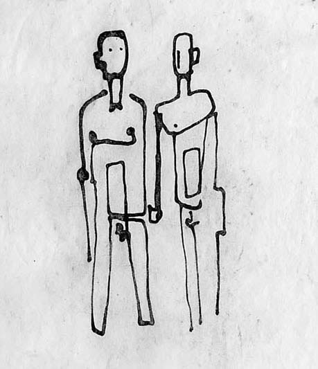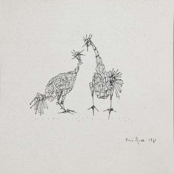 E terminando, ancora un disegno, che ci riporta alla figurazione: una china, tratto unico su carta bagnata (1962). Due figure unite con un braccio solo, che appartiene ad entrambe.
