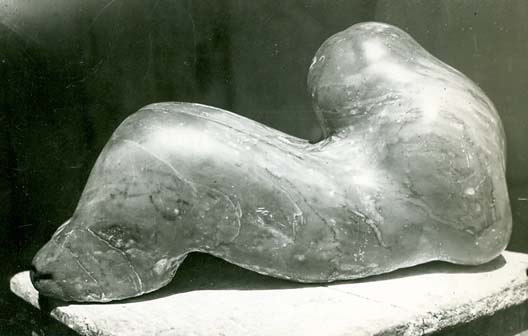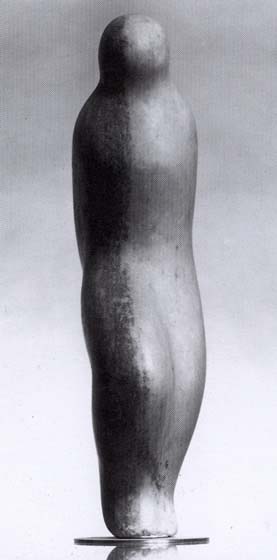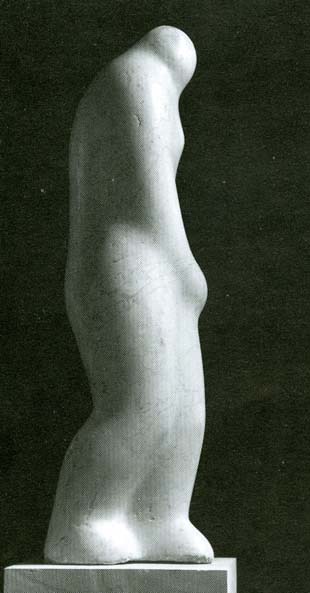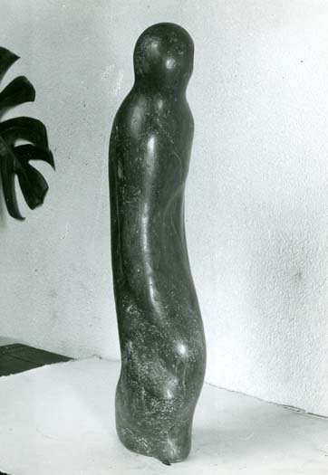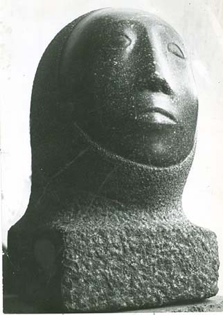 | “Uomo che tenta di camminare”, ma ancora non ce la fa, come impacciato. Con un occhio solo, come il Ciclope omerico. Marmo porfiridico. Esposto e venduto in una ‘personale’ nel 1977 alla Galleria Mosaico di Chiasso. | ![]() |