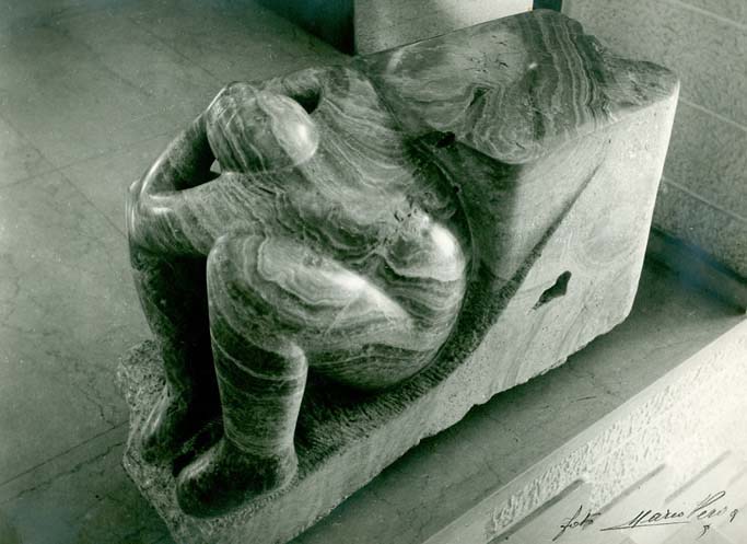 | A questa fase stilistica possiamo riferire anche la bellissima panchina antropomorfa del 1953, “Uomo che chiama dalle scale”, in onice del Portogallo (situata nell’atrio del palazzo al n.1 di Piazza Cacciatori delle Alpi in Como).(Foto Verga) | ||