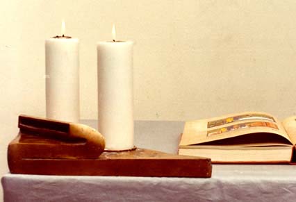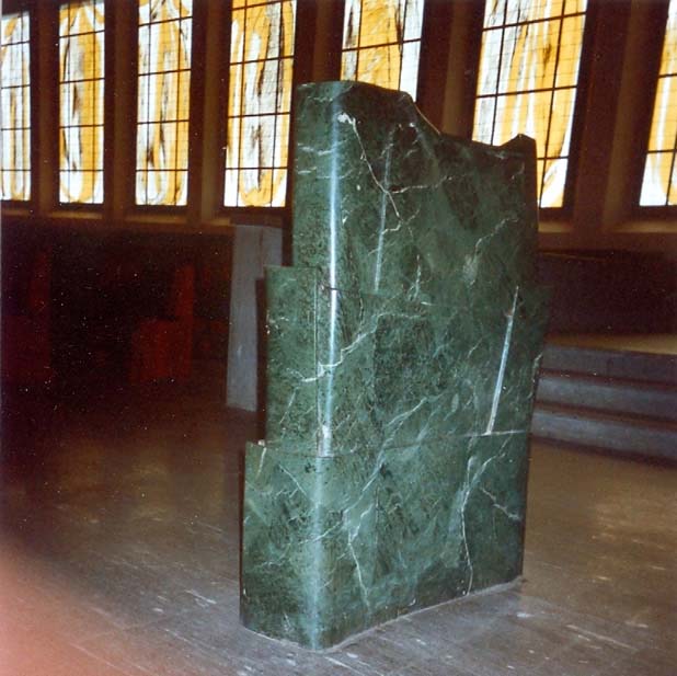 Riva concepisce, anziché Altare e Pulpito, Mensa del Sacrificio e Mensa della Parola, e sono due grossi bianchi blocchi di marmo diagonalizzati, di forma uguale ma di dimensioni diverse: costituiscono i due poli della celebrazione eucaristica.