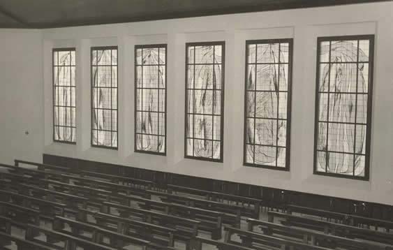 Due i soli colori utilizzati, il giallo e il nero, ma l’effetto è monocolore. “La luce irrompe nello spazio bianco, investe il marmo degli altari, trae bagliori dal Tabernacolo. Le vetrate del mattino illuminano la grande aula, mentre la dolce luce meridiana filtra dalle vetrate della cappella, luogo della sosta e del raccoglimento” (Angela Bernaschina, cit.)