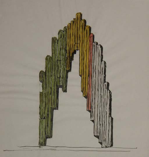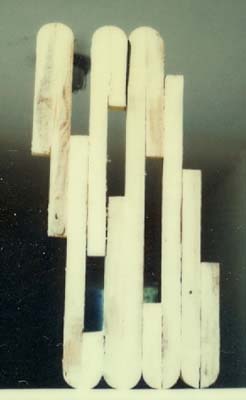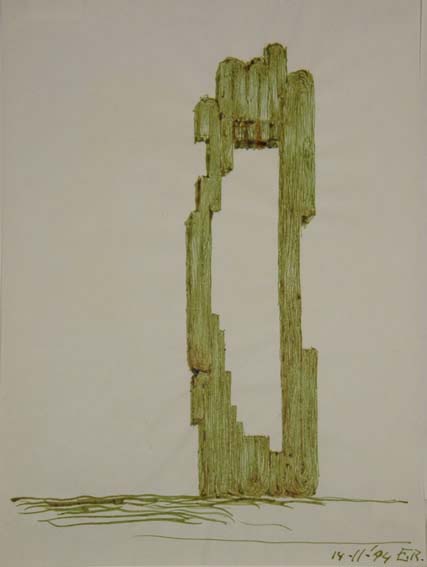 | Nessuna indicazione esplicativa che riguardi i “Cancelli” è stata trovata, fra le carte di Eli Riva, che spieghi il senso di queste opere. Se i “Verticali” rappresentano simbolicamente la verticalità, l’aspirazione verso l’alto, l’anelito che è di ognuno, la …icarità dell’uomo (c’è un corrispettivo nel figurativo in quel piccolo uomo di legno - l’“Omino” - sulla punta dei piedi che l’autore stesso ha chiamato “Volare”); se le “Fionde” rappresentano l’opposto, la … ‘terrestrità’, l’espansione in orizzontale che è l’unica possibile all’uomo, con il suo carico di tensione, energia, senso di lotta etc…; i “Cancelli” sembrano essere, almeno in senso tecnico, un … momento di comodo. Simbolicamente mimano il movimento ritmico delle canne di un organo. |