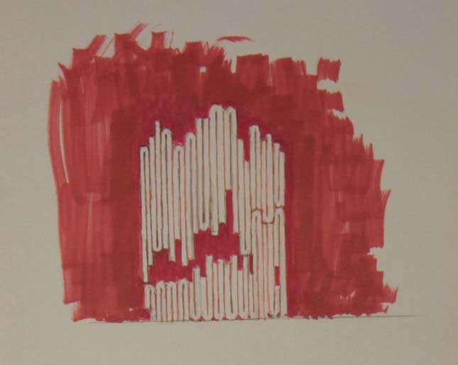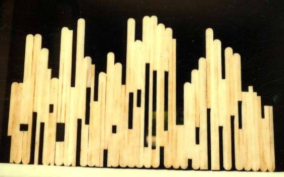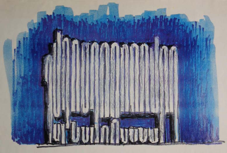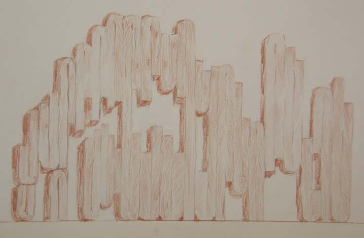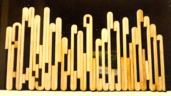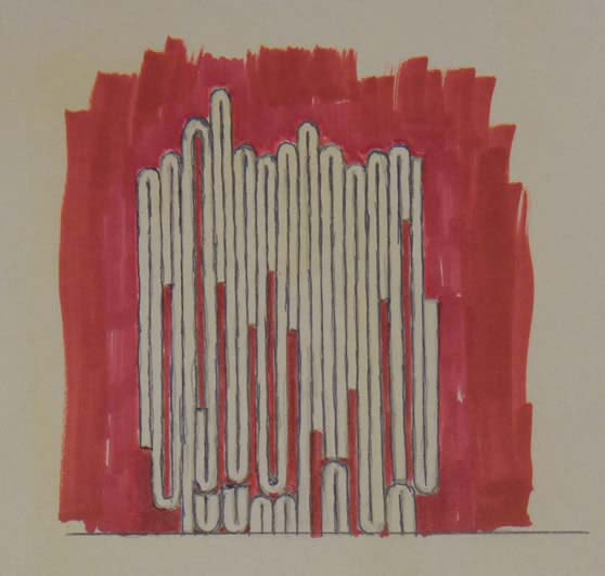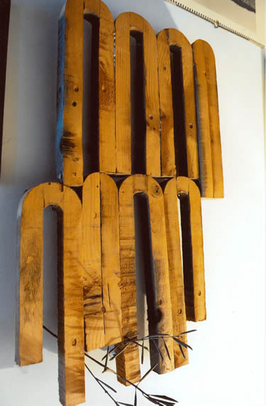 Legni assemblati a fare parete, sculture piatte, bidimensionali. Bidimensionali ma non bassorilievo, secondo l’accezione classica che si ha di quest’ultimo. Paraste, lesene, quasi a mimare, come si diceva, un andamento di canne d’organo.