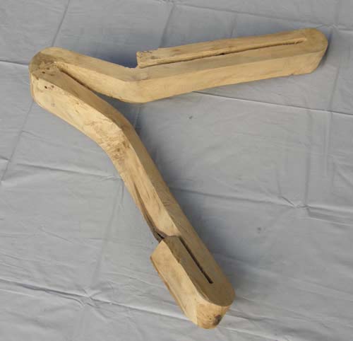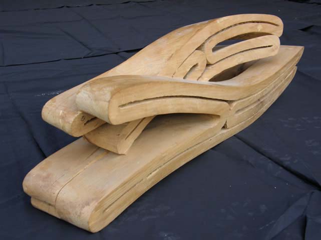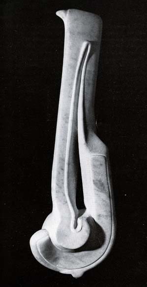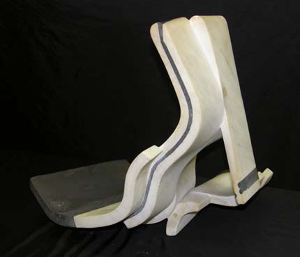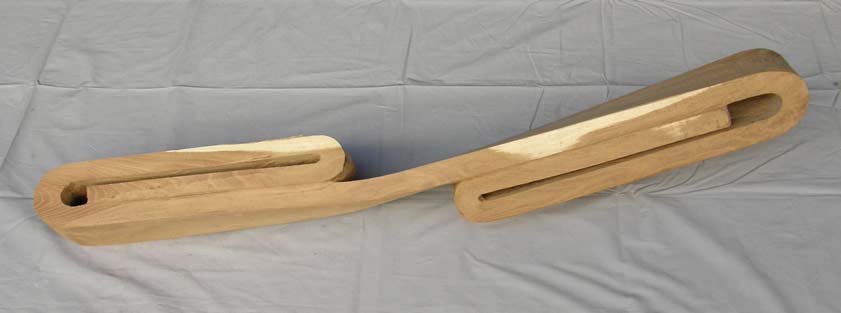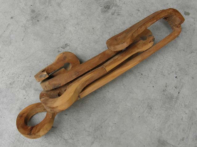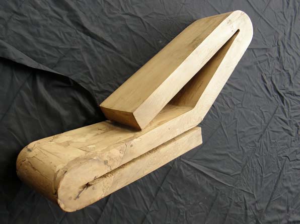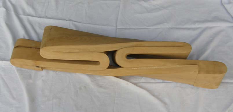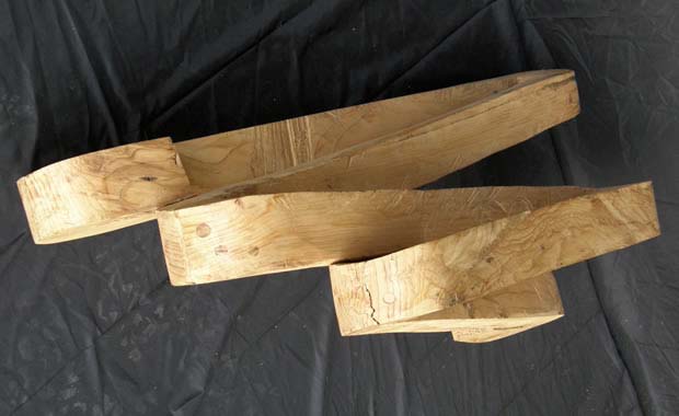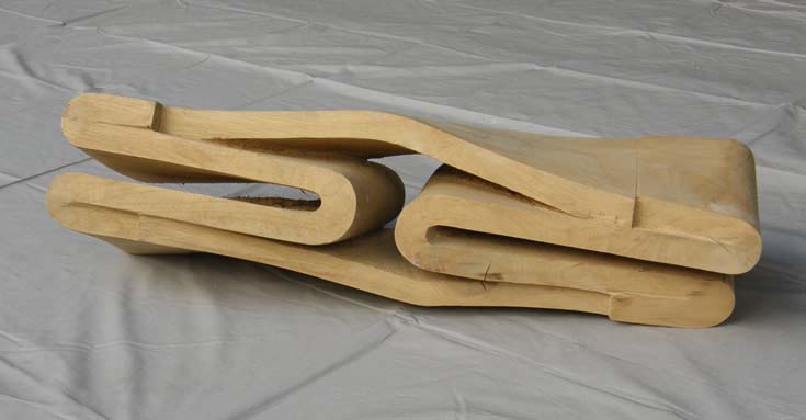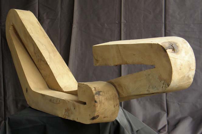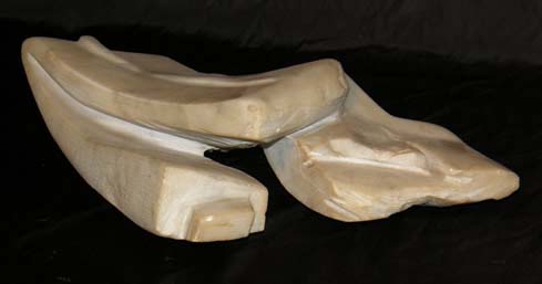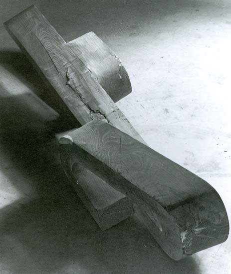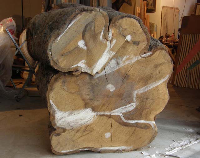 E’ un abbozzo: sono evidenti i primi segni indicativi bianchi in gesso; è la prima ricerca per individuare i possibili canali (le possibili vie) di intervento dettate dal legno stesso. Togliere : la scultura è togliere,