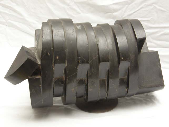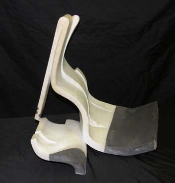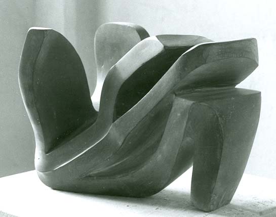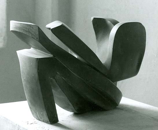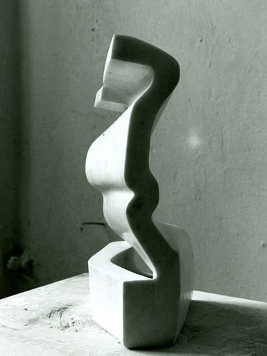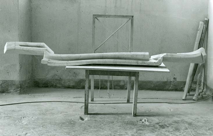 “…. C’è sul trespolo un abbozzo di scultura. Quando abbozzo una scultura – dice Eli Riva – vivo il momento più intenso perché nell’abbozzo velocemente si rivela l’immagine desiderata e nasce la tentazione di scoprirla. Il blocco ha già dato una idea per individuare lo spessore. Il momento della ricerca si fonde già insieme alla condizione del tronco. Quello che vuole essere immagine della idea di scultura si inserisce nella dimensione del volume, ed è il momento più intenso che poi viene elaborato e porta al momento espressivo desiderato”.