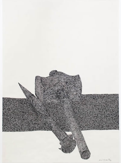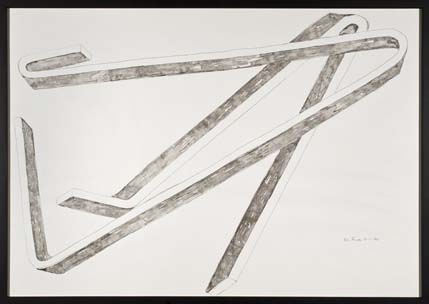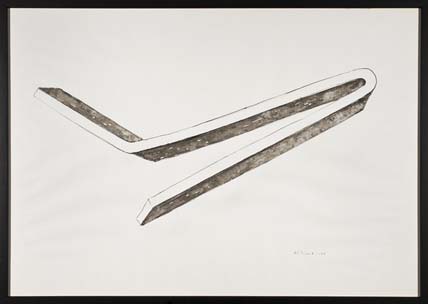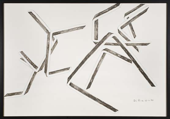 Eli Riva disegnava molto, addirittura mesi, come per i disegni che abbiamo chiamato “Nastri” e che preludono alle “Fionde”, oppure quelli che preludono alle “Case degli Angeli”.