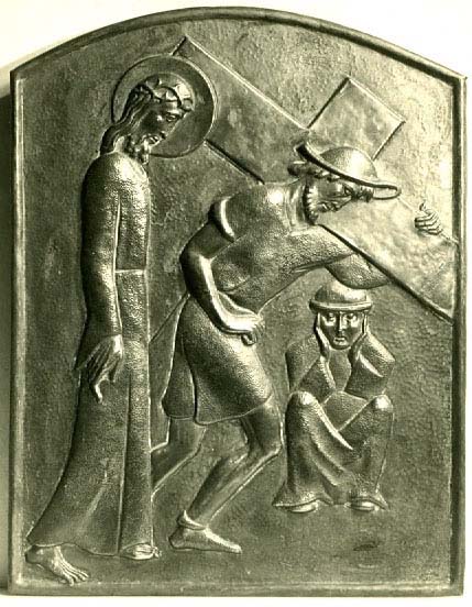 Il tema della “Via Crucis” torna più volte nella produzione scultorea di Eli Riva, sia per volere dei committenti, sia per libera scelta dell’artista, “profondamente colpito dal doloroso racconto dell’Uomo sulla via del Calvario”. Eli Riva si definiva infatti “cristologico”. Una prima “Via Crucis”, giovanile, fu eseguita in Ticino quando, dopo aver lasciato Milano e dopo un soggiorno culturale a Parigi con l’amico pittore Brignole D’Arena, egli si trasferì nella vicina Svizzera Italiana per una permanenza lavorativa nello studio dello scultore svizzero Remo Rossi, all’incirca tra il 1946 e il 1948. Di questa “Via Crucis” purtroppo abbiamo perso le tracce. Non siamo a conoscenza di quale sia la chiesa che la ospita e invitiamo chi ne avesse notizie a fornirle. |